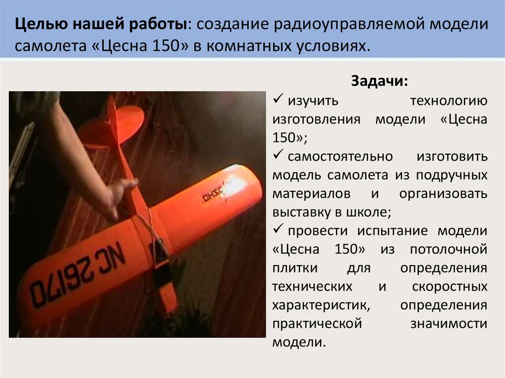 Целью нашей работы: создание радиоуправляемой моделисамолета «Цесна 150» в комнатных условиях.