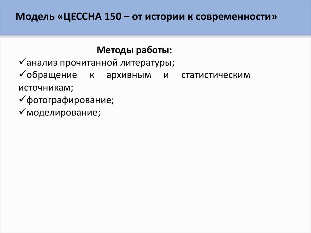 Модель «ЦЕССНА 150 – от истории к современности»Методы работы: