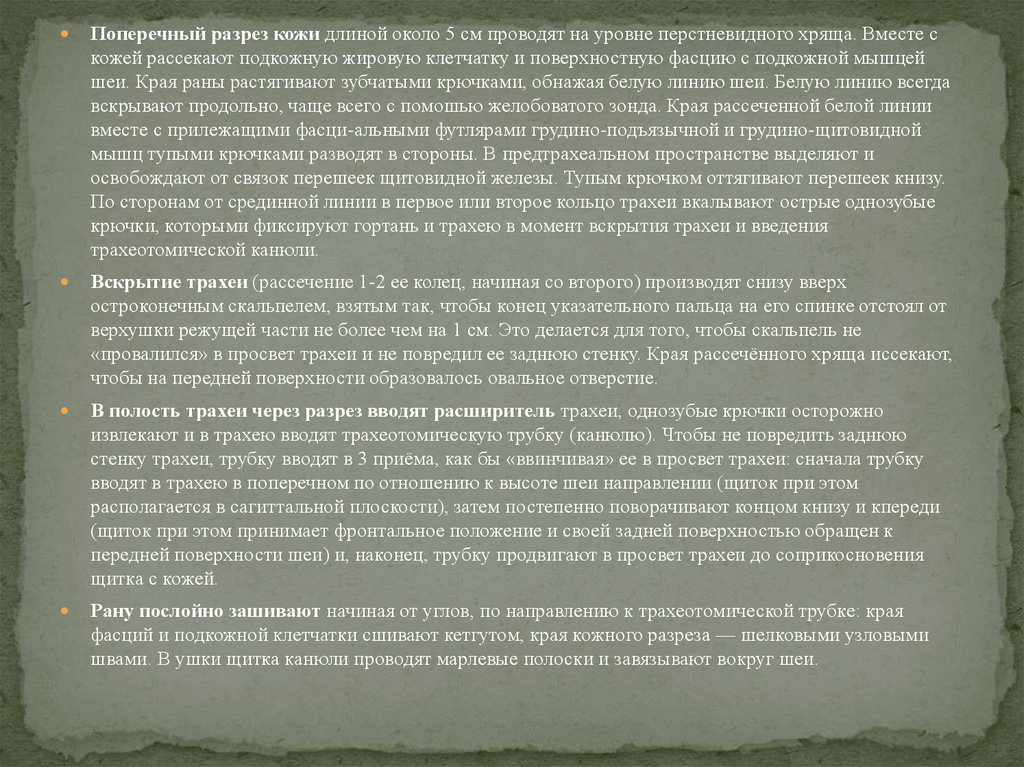 Поперечный разрез кожи длиной около 5 см проводят на уровне перстневидного хряща. Вместе скожей рассекают подкожную жировую клетчатку и поверхностную фасцию с подкожной мышцей