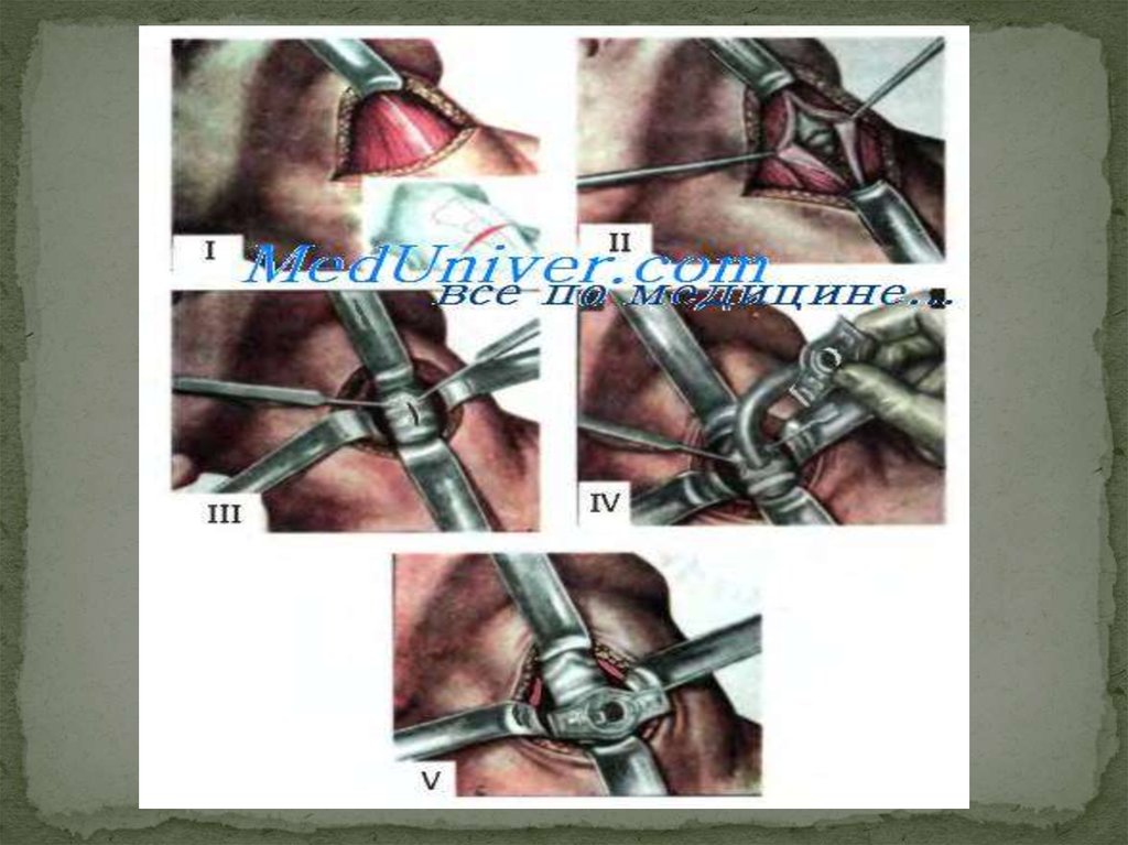 шеи. Края раны растягивают зубчатыми крючками, обнажая белую линию шеи. Белую линию всегда