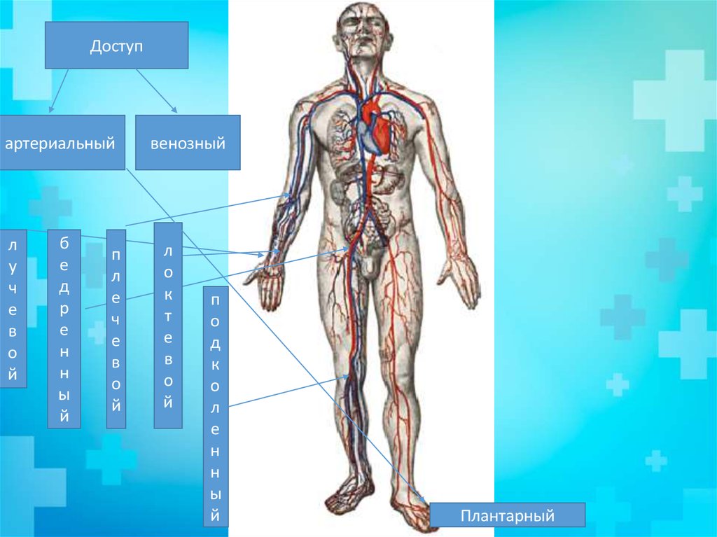 14. Изображение различий в условиях катетеризации устьев коронарных артерий через левый/правый лучевой и бедренный доступы: