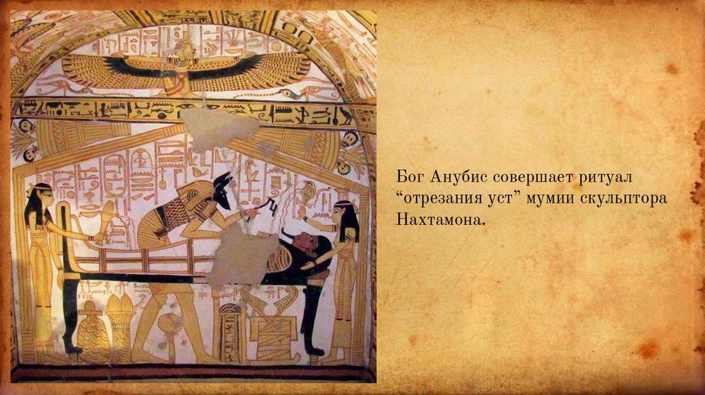 Бог Анубис совершает ритуал“отрезания уст” мумии скульптора