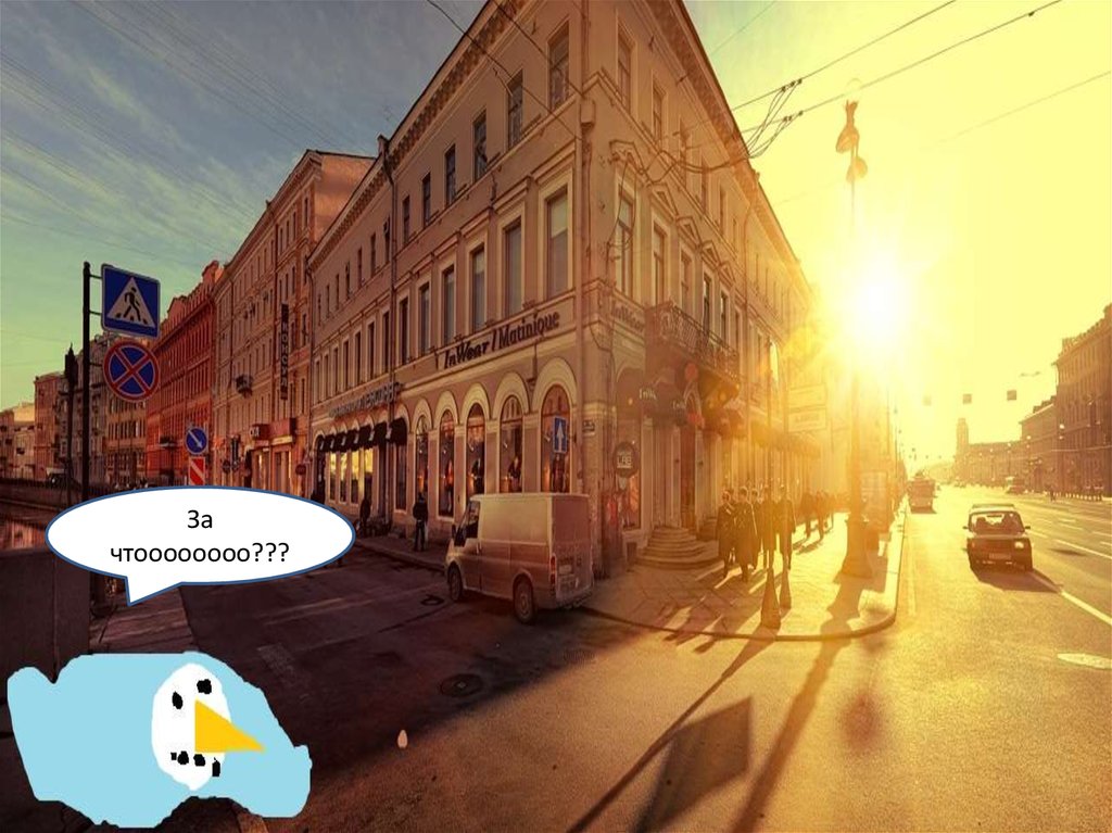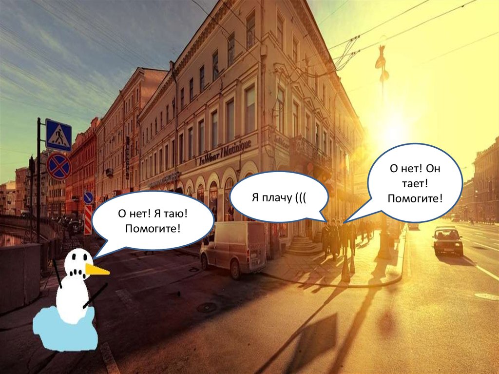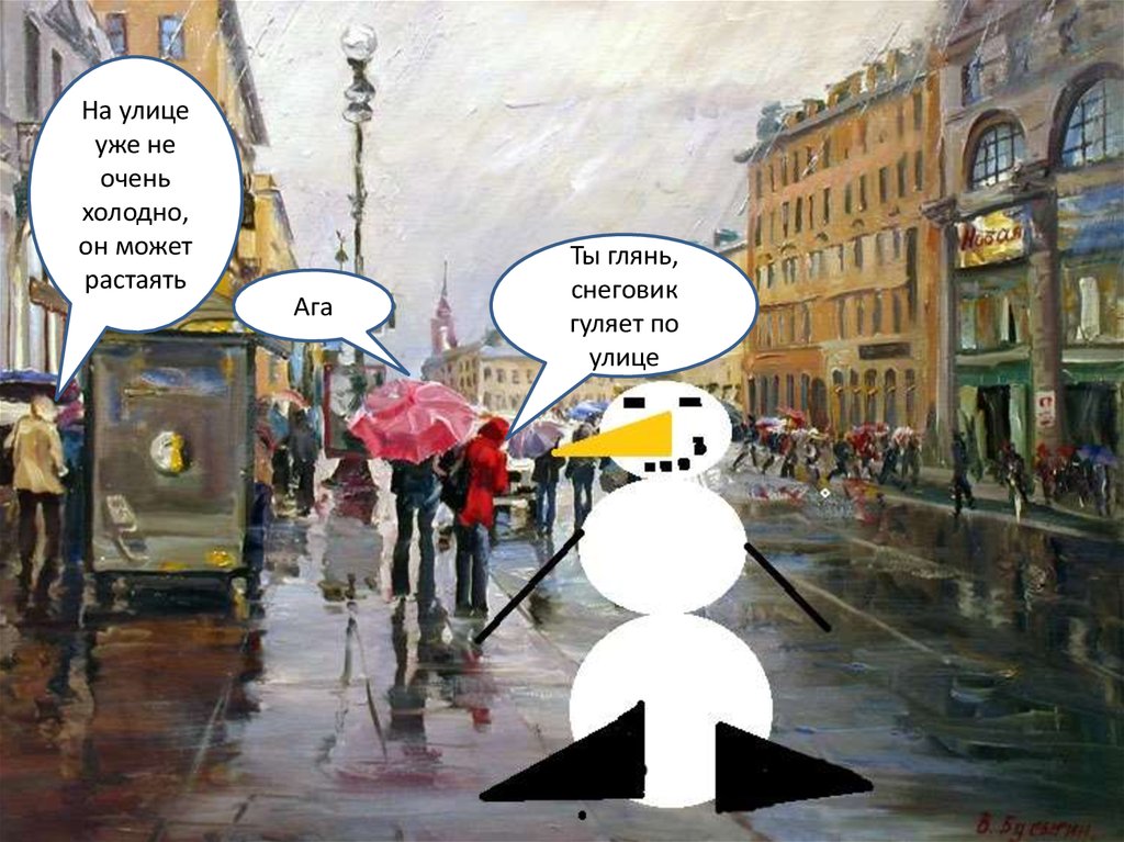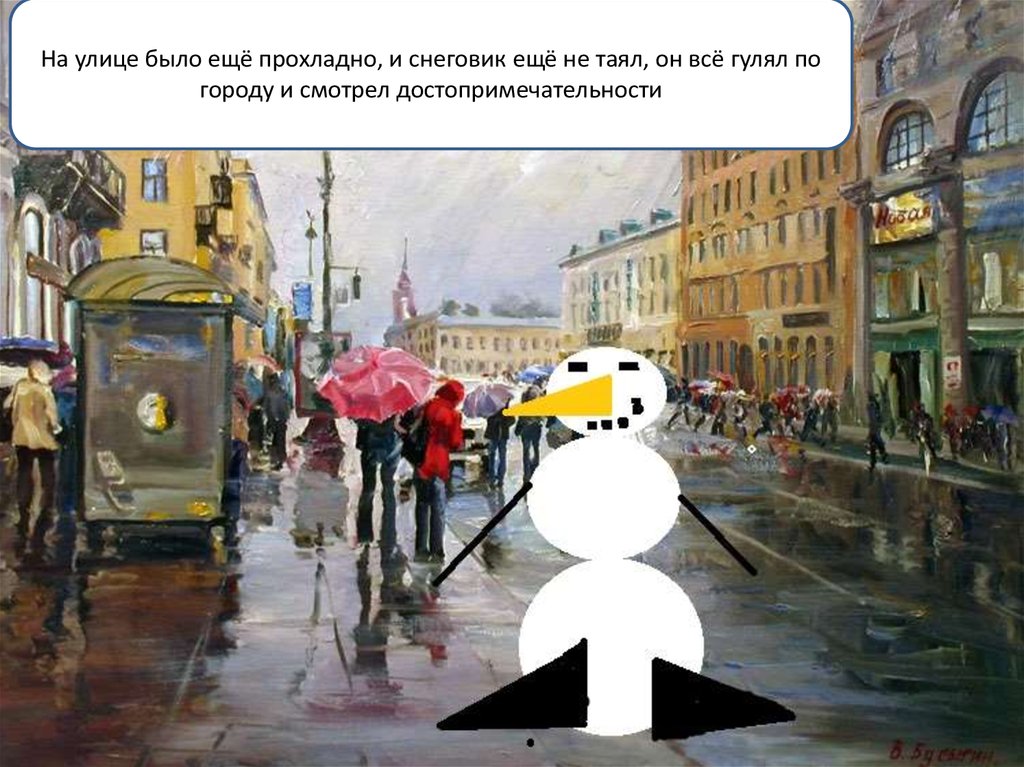 На улице было ещё прохладно, и снеговик ещё не таял, он всё гулял погороду и смотрел достопримечательности