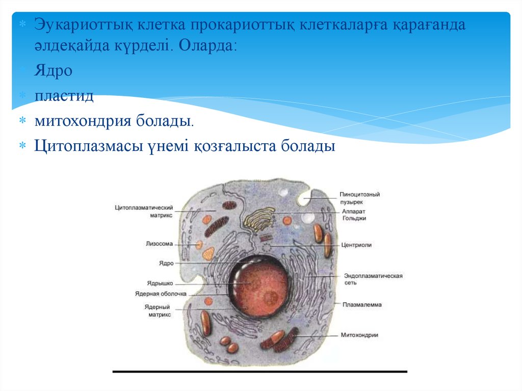 Эукариоттық клетка прокариоттық клеткаларға қарағандаәлдеқайда күрделі. Оларда: