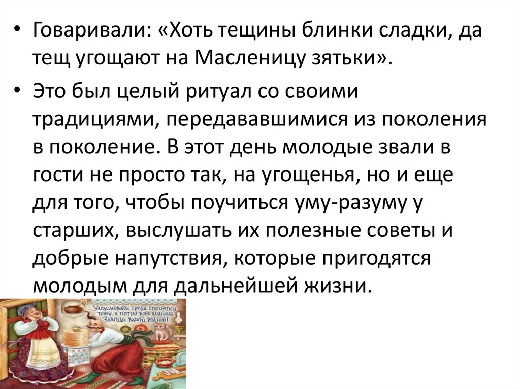 • Говаривали: «Хоть тещины блинки сладки, датещ угощают на Масленицу зятьки».