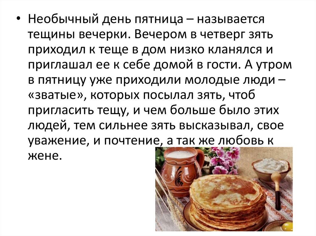 • Необычный день пятница – называетсятещины вечерки. Вечером в четверг зять