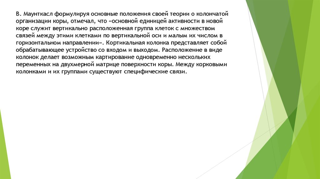 В. Маунткасл формулируя основные положения своей теории о колончатойорганизации коры, отмечал, что «основной единицей активности в новой
