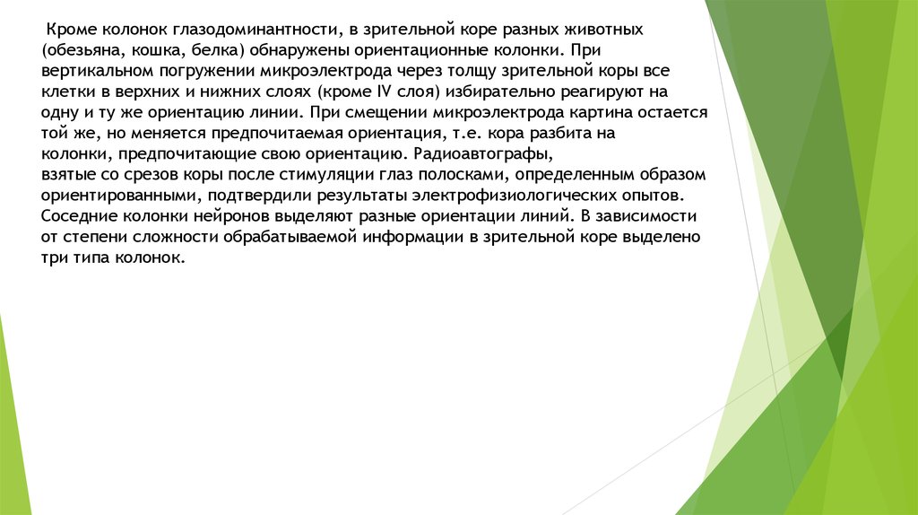 Кроме колонок глазодоминантности, в зрительной коре разных животных(обезьяна, кошка, белка) обнаружены ориентационные колонки. При