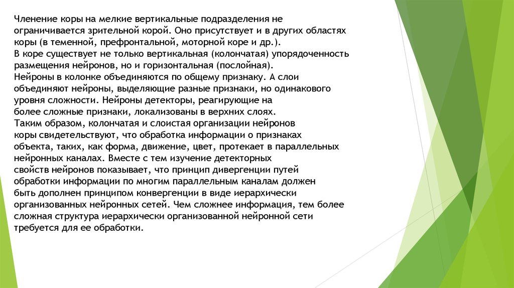 Изучение вертикальных и горизонтальных связей нейронов детекторовразличного типа привело к открытию общих принципов нейронной