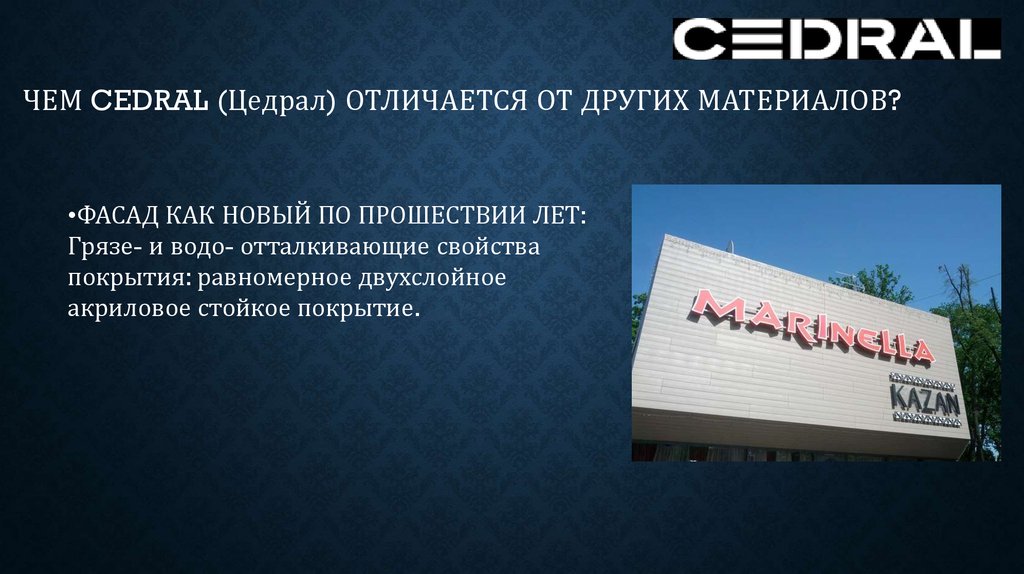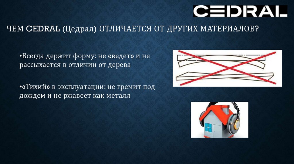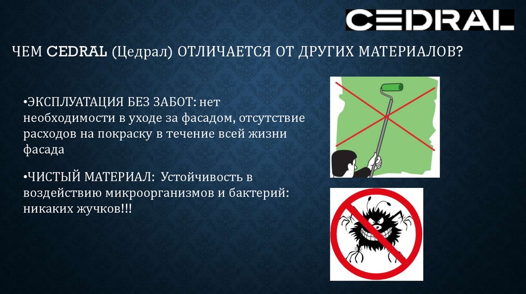 ЧЕМ CEDRAL (Цедрал) ОТЛИЧАЕТСЯ ОТ ДРУГИХ МАТЕРИАЛОВ?•ЭКСПЛУАТАЦИЯ БЕЗ ЗАБОТ: нет