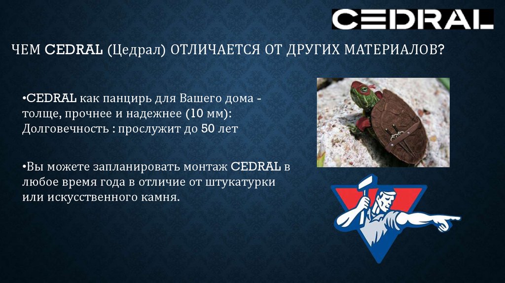 ЧЕМ CEDRAL (Цедрал) ОТЛИЧАЕТСЯ ОТ ДРУГИХ МАТЕРИАЛОВ?•CEDRAL как панцирь для Вашего дома толще, прочнее и надежнее (10 мм):