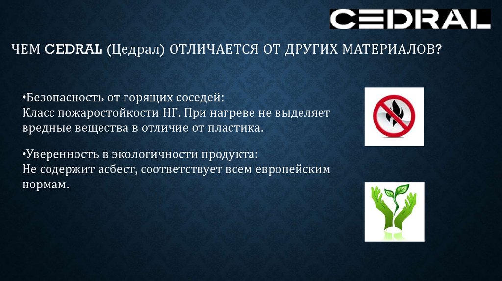 ЧЕМ CEDRAL (Цедрал) ОТЛИЧАЕТСЯ ОТ ДРУГИХ МАТЕРИАЛОВ?•Безопасность от горящих соседей: