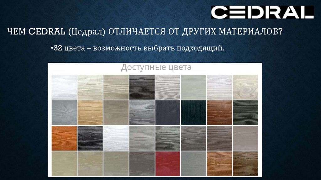 ЧЕМ CEDRAL (Цедрал) ОТЛИЧАЕТСЯ ОТ ДРУГИХ МАТЕРИАЛОВ?•32 цвета – возможность выбрать подходящий.