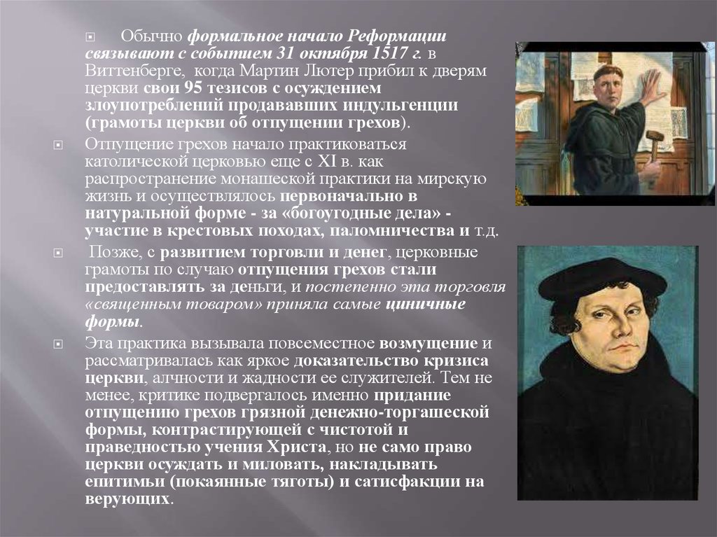 Обычно формальное начало Реформациисвязывают с событием 31 октября 1517 г. в