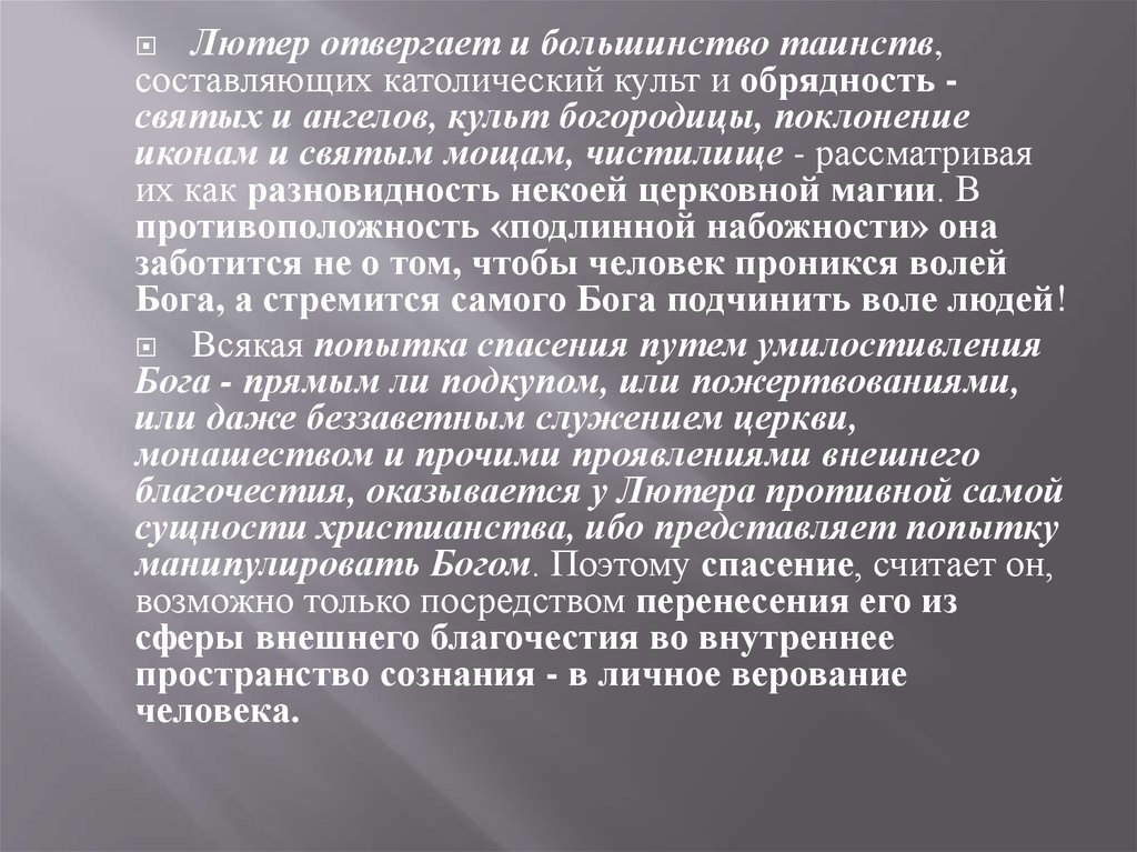 Лютер отвергает и большинство таинств,составляющих католический культ и обрядность святых и ангелов, культ богородицы, поклонение