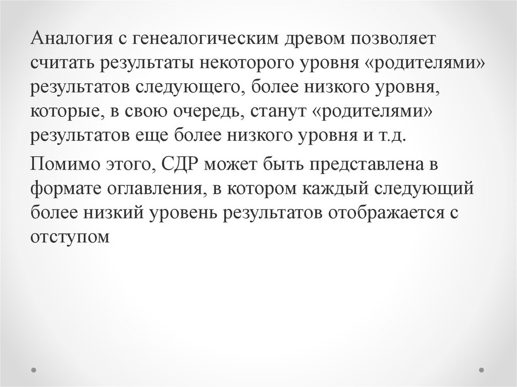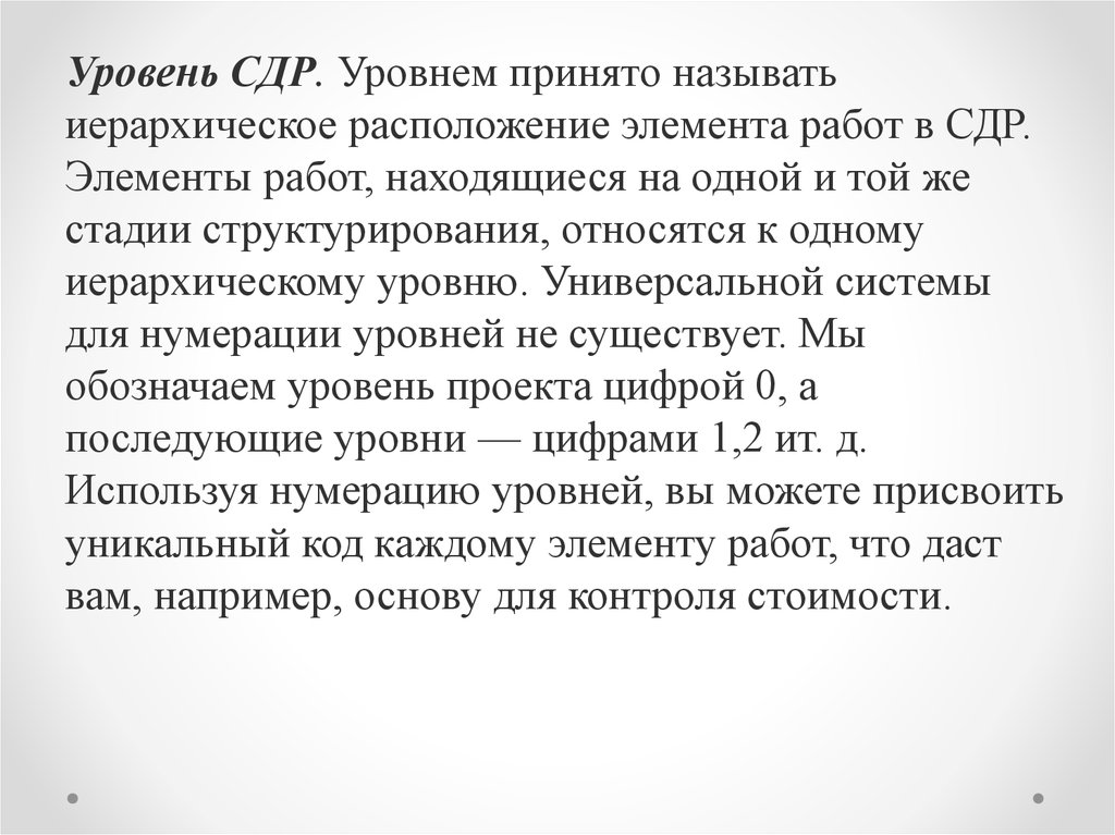 Уровень СДР. Уровнем принято называтьиерархическое расположение элемента работ в СДР.