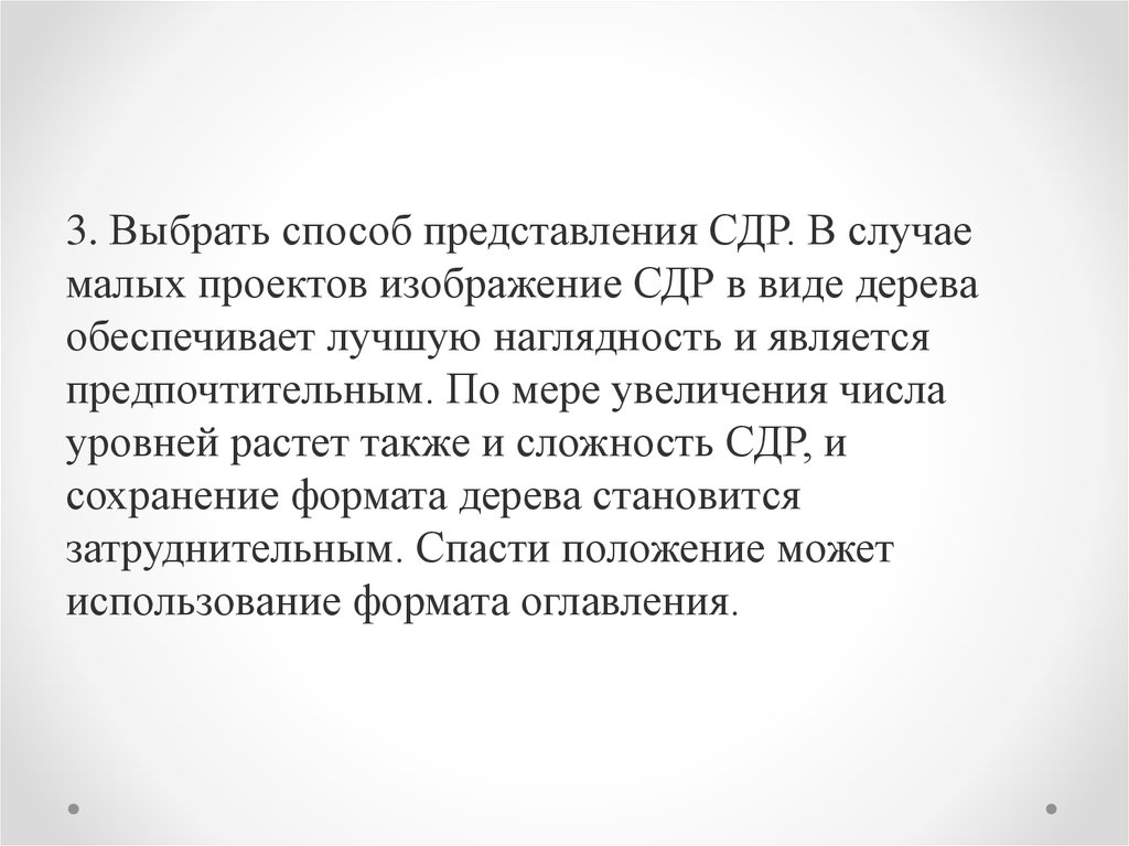 3. Выбрать способ представления СДР. В случаемалых проектов изображение СДР в виде дерева