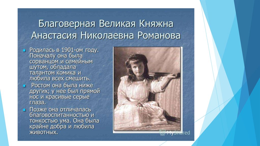 Мои святые.2. Анастаси́я Никола́евна (Романова); (5 (18) июня 1901, Петергоф — в ночь с 16 на 17 июля 1918, Екатеринбург) — великая княжна,