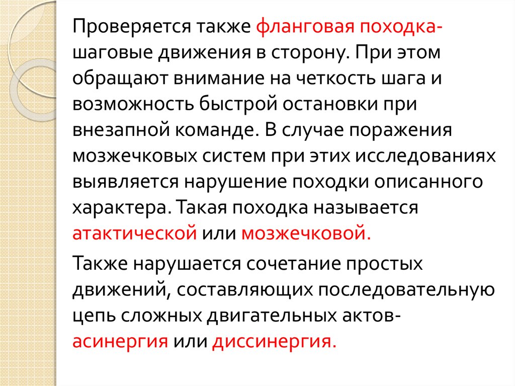 Проверяется также фланговая походкашаговые движения в сторону. При этомобращают внимание на четкость шага и