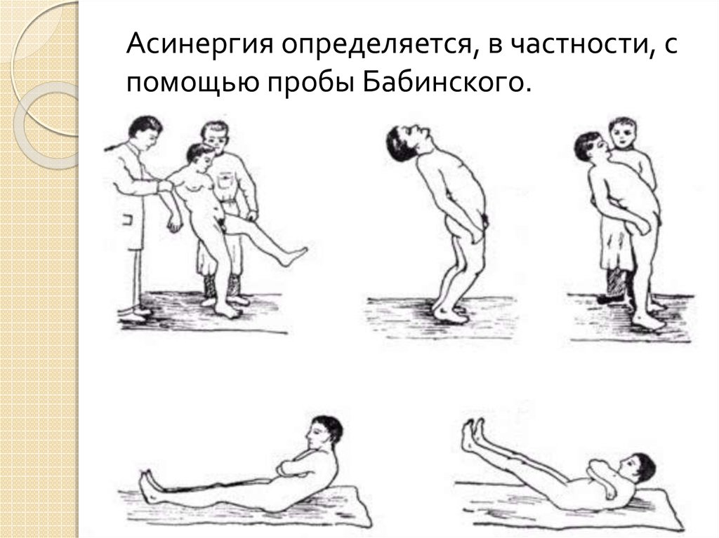 Асинергия определяется, в частности, спомощью пробы Бабинского.