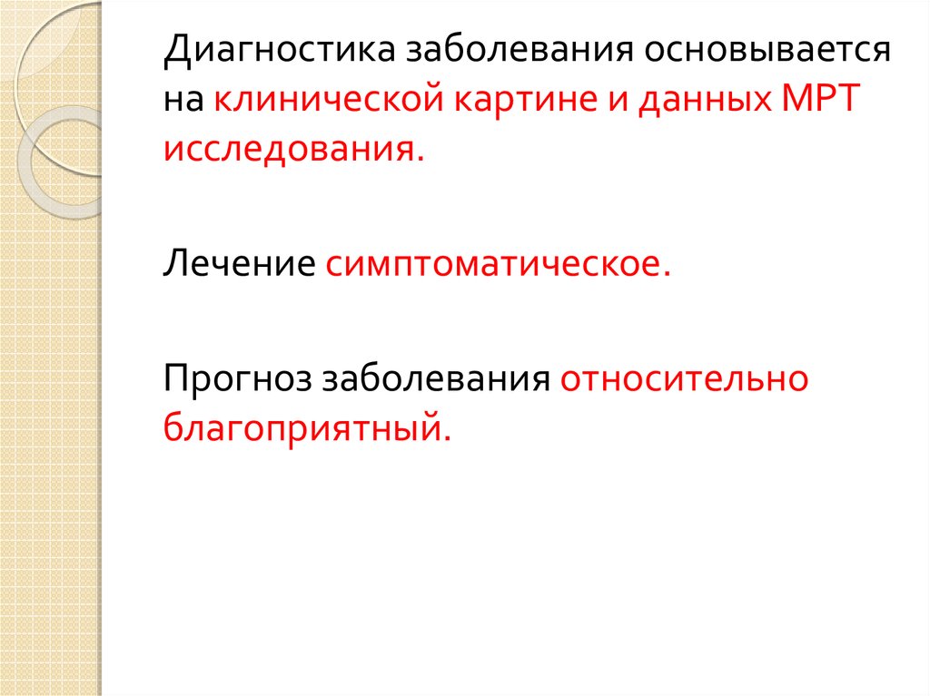 Диагностика заболевания основываетсяна клинической картине и данных МРТ