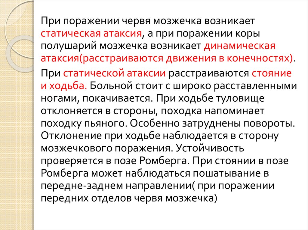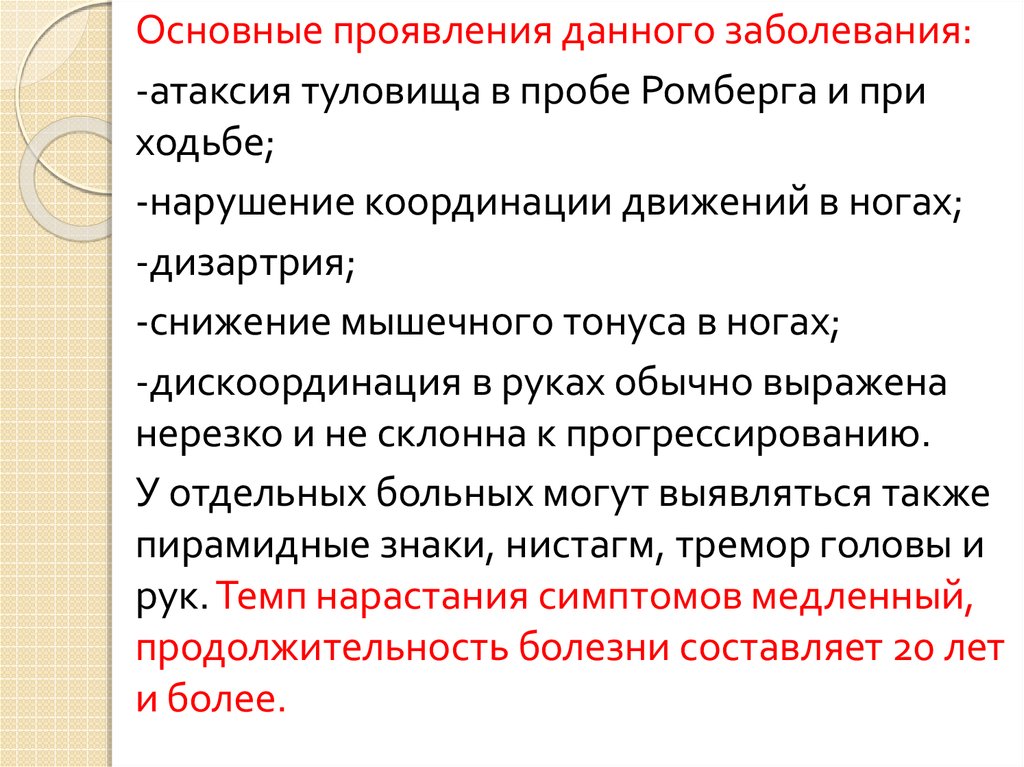 Основные проявления данного заболевания:-атаксия туловища в пробе Ромберга и при