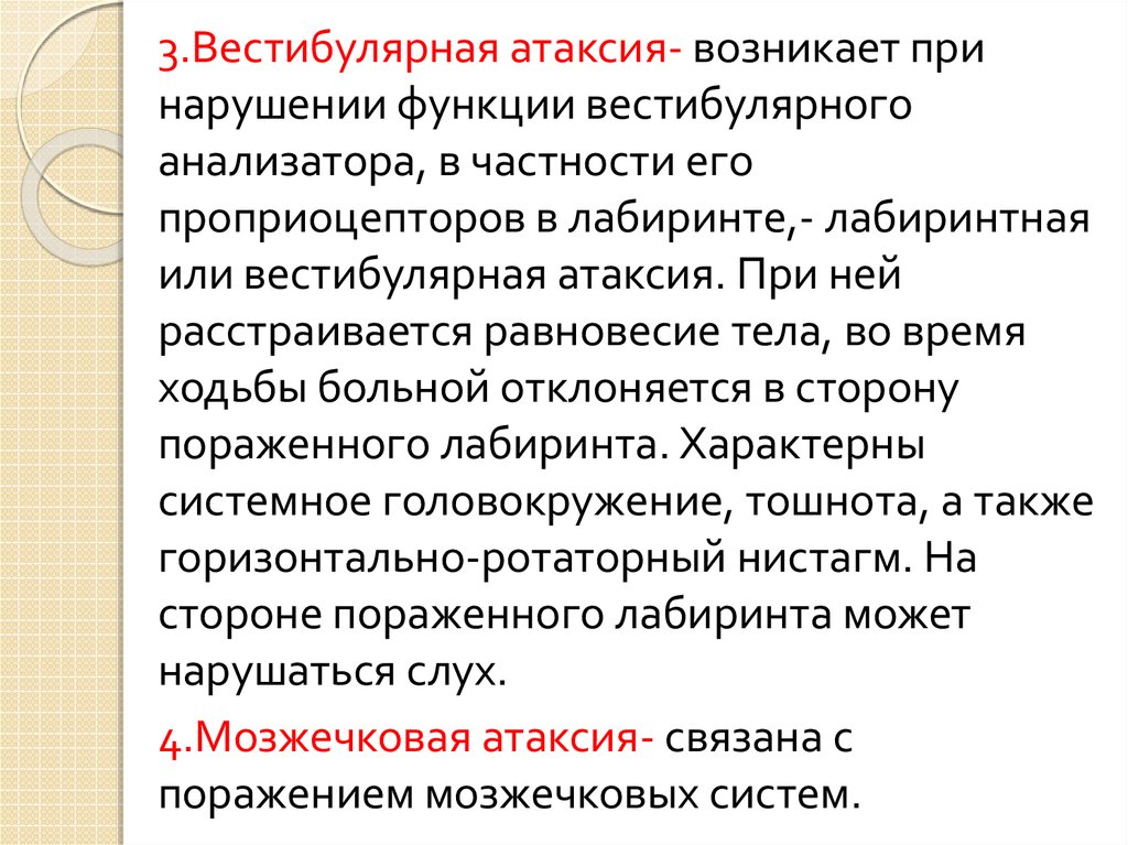 3.Вестибулярная атаксия- возникает принарушении функции вестибулярного
