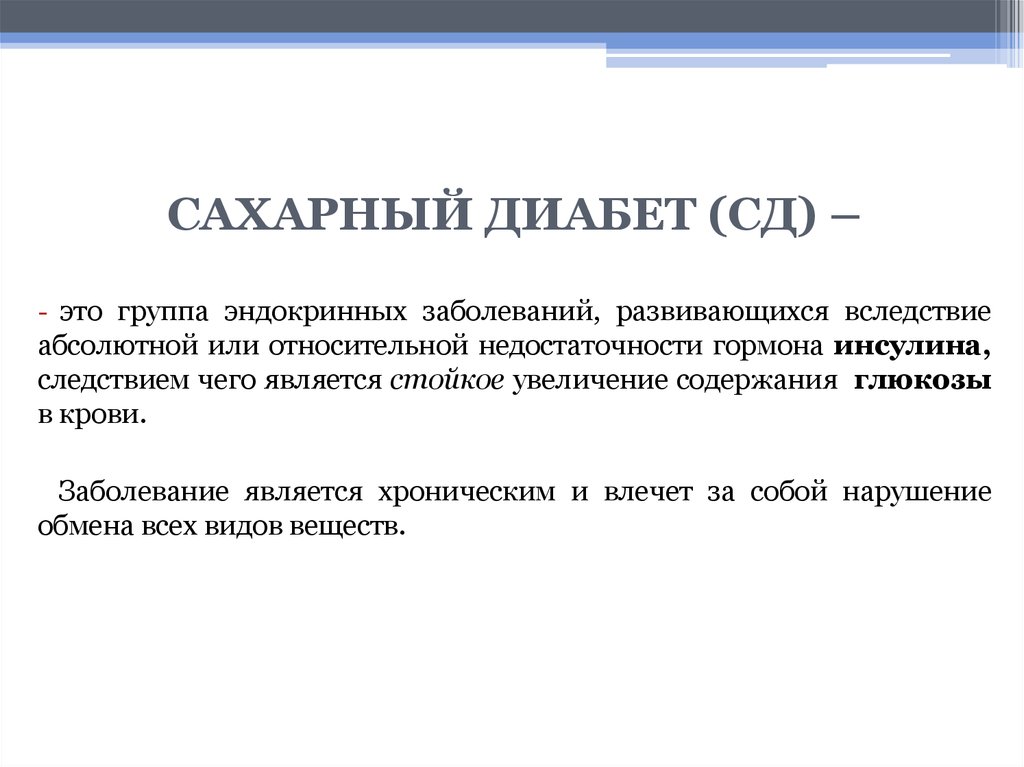 САХАРНЫЙ ДИАБЕТ (СД) –- это группа эндокринных заболеваний, развивающихся вследствие