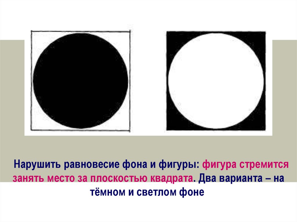 Нарушить равновесие фона и фигуры: фигура стремитсязанять место за плоскостью квадрата. Два варианта – на