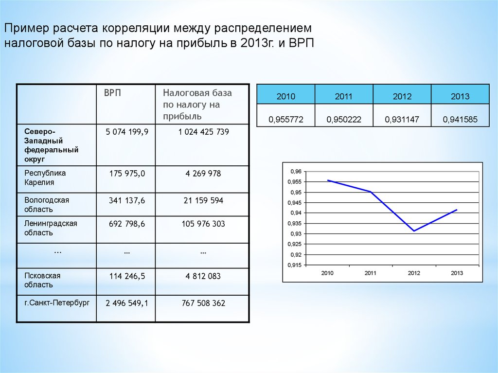 Пример расчета корреляции между распределениемналоговой базы по налогу на прибыль в 2013г. и ВРП