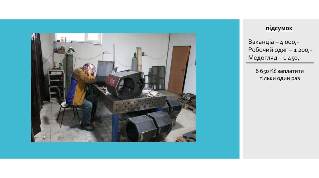 підсумокBаканціa – 4 000,Pобочий одяг – 1 200,Медогляд – 1 450,6 650 Kč заплатити