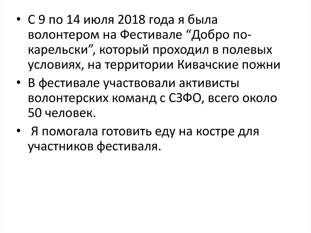 • С 9 по 14 июля 2018 года я былаволонтером на Фестивале “Добро покарельски”, который проходил в полевых