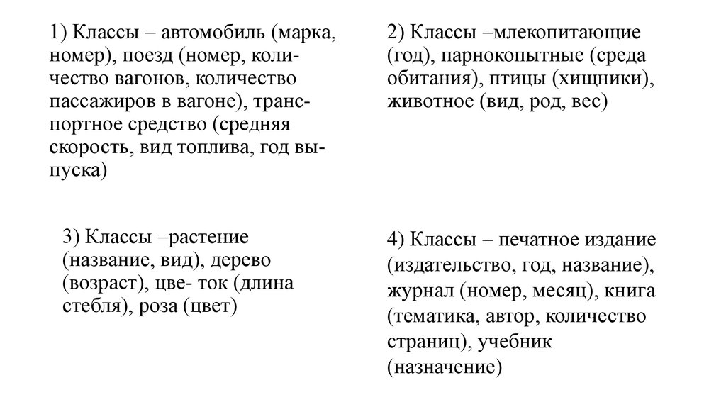 1) Классы – автомобиль (марка,номер), поезд (номер, количество вагонов, количество