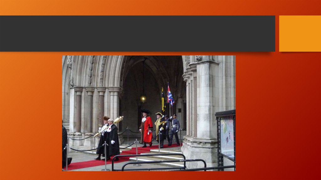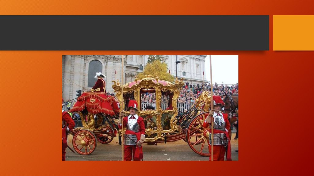 • The Lord Mayor's Show is held on the day after taking office; theLord Mayor, preceded by a procession, travels to the Royal Courts