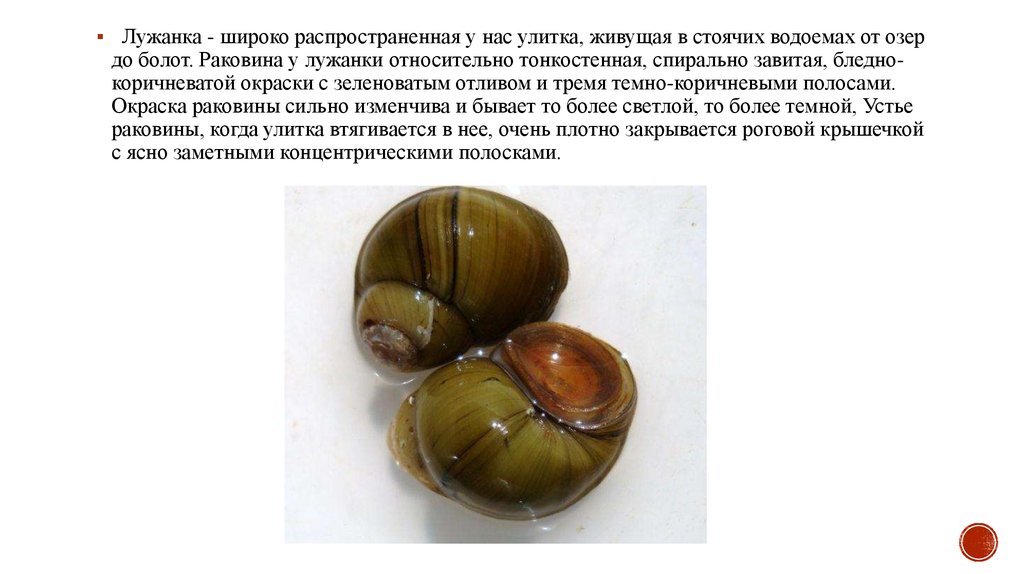 Лужанка - широко распространенная у нас улитка, живущая в стоячих водоемах от озердо болот. Раковина у лужанки относительно тонкостенная, спирально завитая, бледнокоричневатой окраски с зеленоватым отливом и тремя темно-коричневыми полосами.