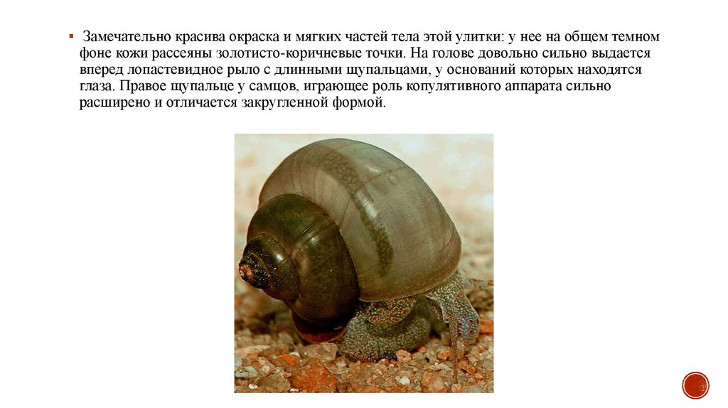 Замечательно красива окраска и мягких частей тела этой улитки: у нее на общем темномфоне кожи рассеяны золотисто-коричневые точки. На голове довольно сильно выдается
