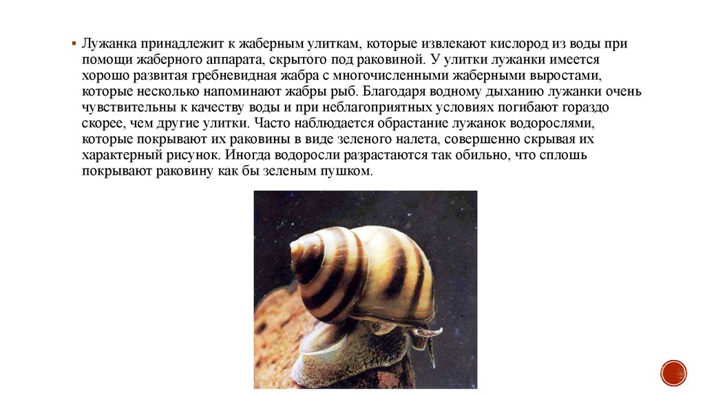 скорее, чем другие улитки. Часто наблюдается обрастание лужанок водорослями,