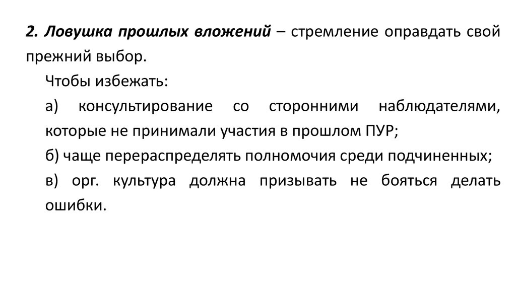 2. Ловушка прошлых вложений – стремление оправдать свойпрежний выбор.