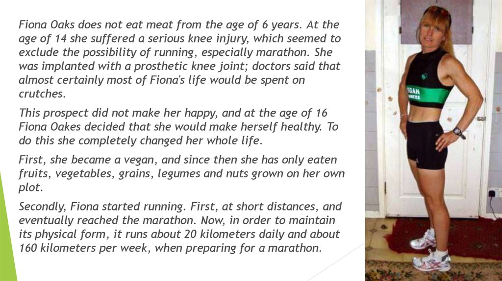 Fiona Oaks does not eat meat from the age of 6 years. At theage of 14 she suffered a serious knee injury, which seemed to