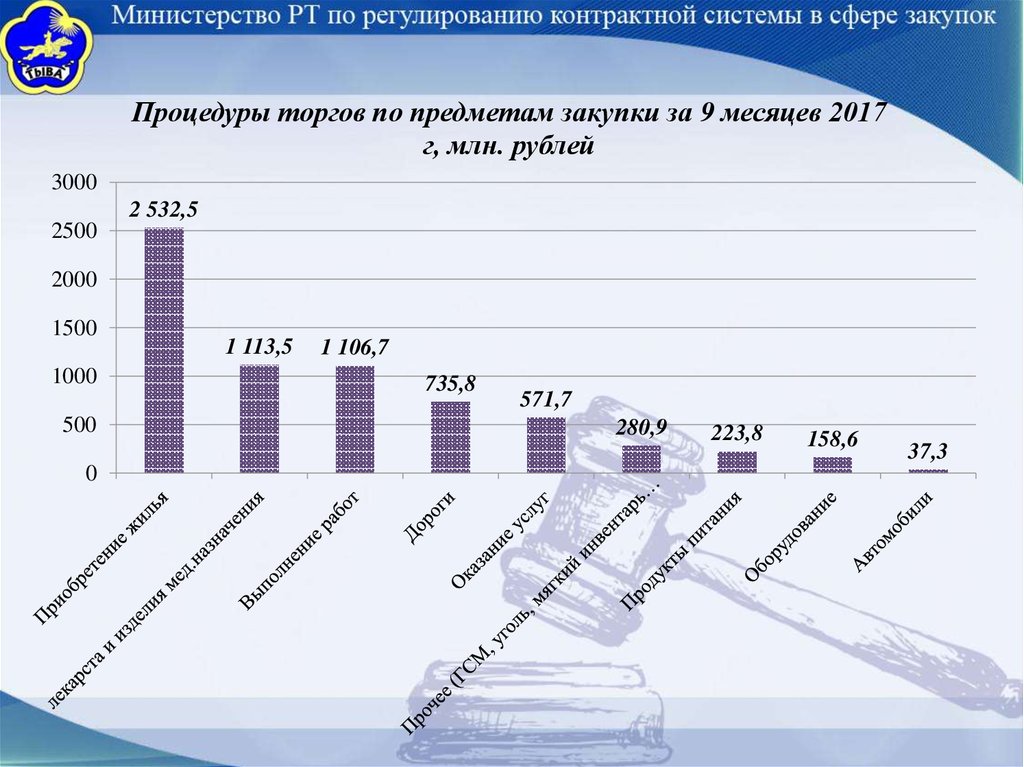 Процедуры торгов по предметам закупки за 9 месяцев 2017г, млн. рублей