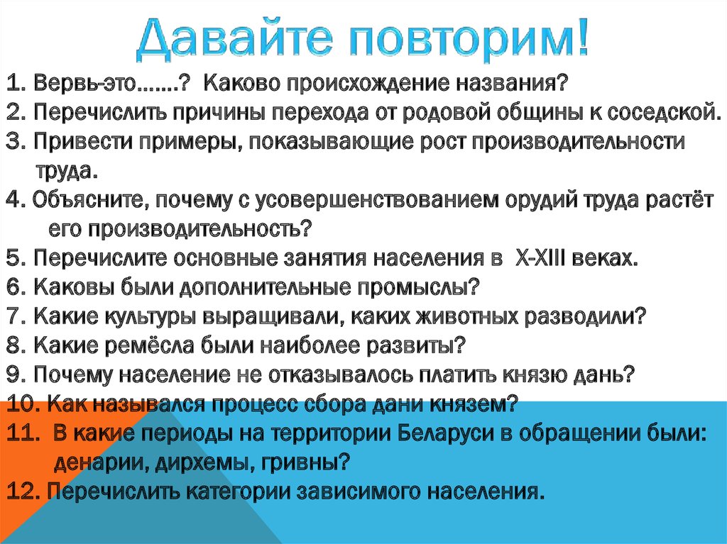 1. Вервь-это…….? Каково происхождение названия?2. Перечислить причины перехода от родовой общины к соседской.