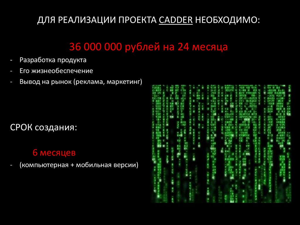 ДЛЯ РЕАЛИЗАЦИИ ПРОЕКТА CADDER НЕОБХОДИМО:36 000 000 рублей на 24 месяца