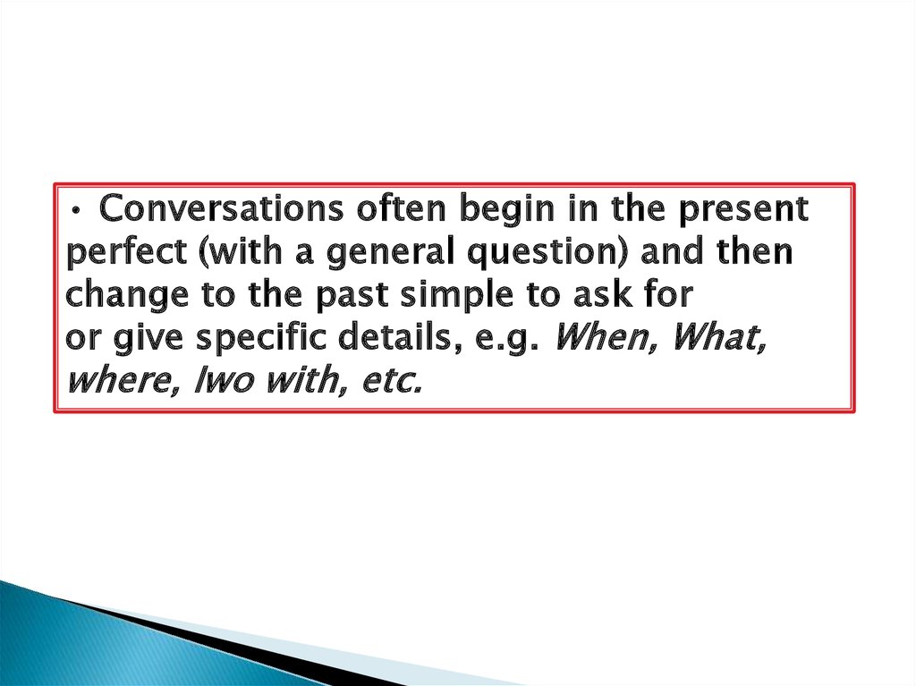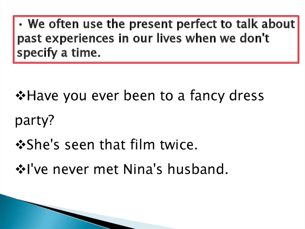 • We often use the present perfect to talk aboutpast experiences in our lives when we don't