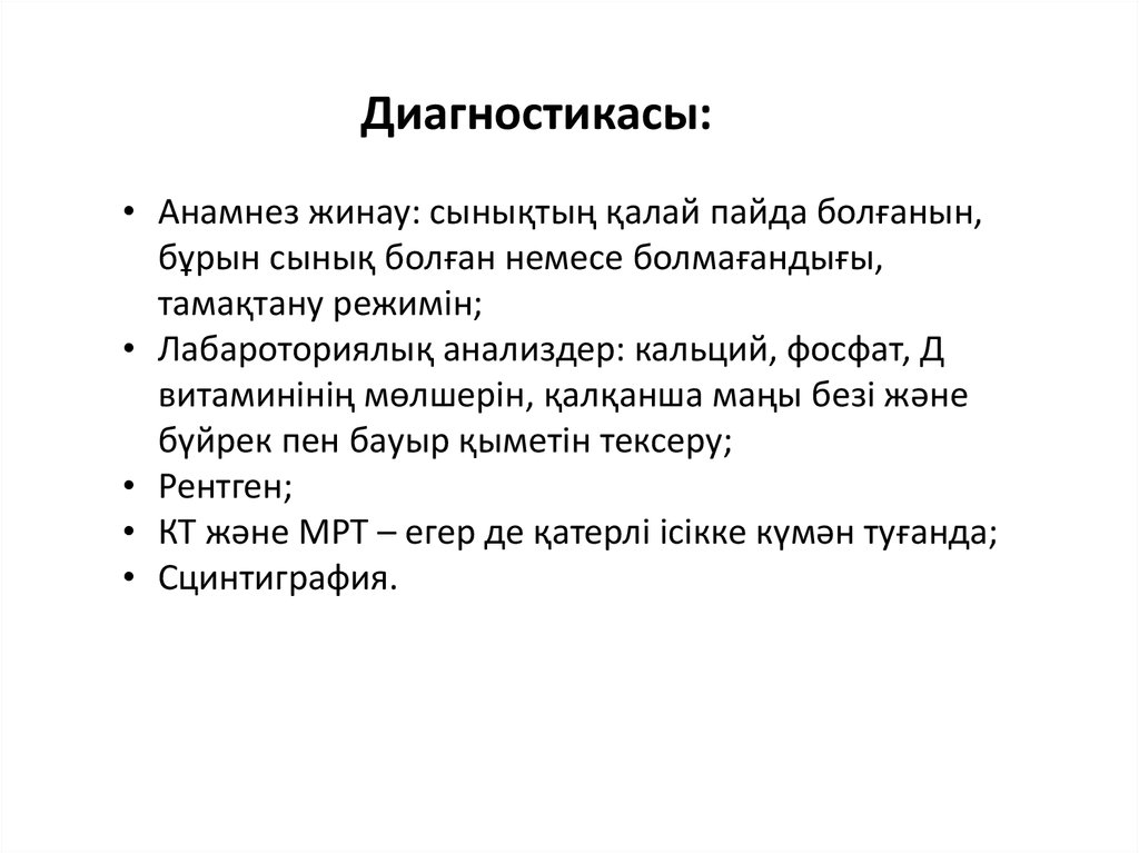 Диагностикасы:• Анамнез жинау: сынықтың қалай пайда болғанын,