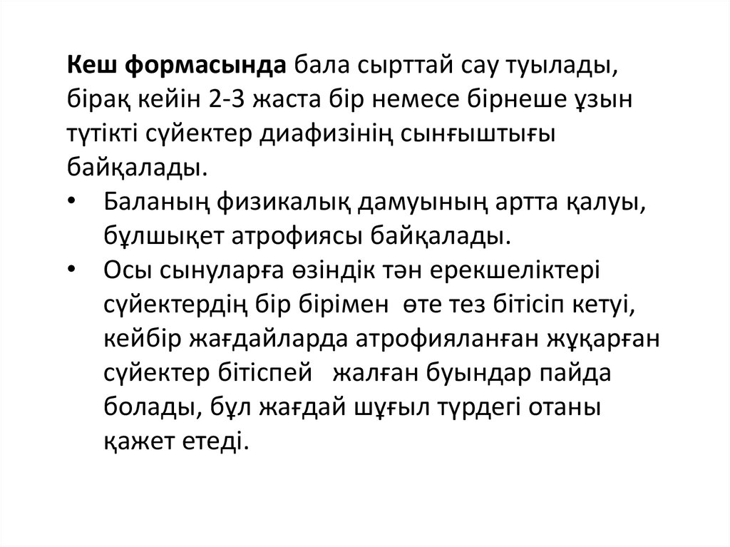 Кеш формасында бала сырттай сау туылады,бірақ кейін 2-3 жаста бір немесе бірнеше ұзын