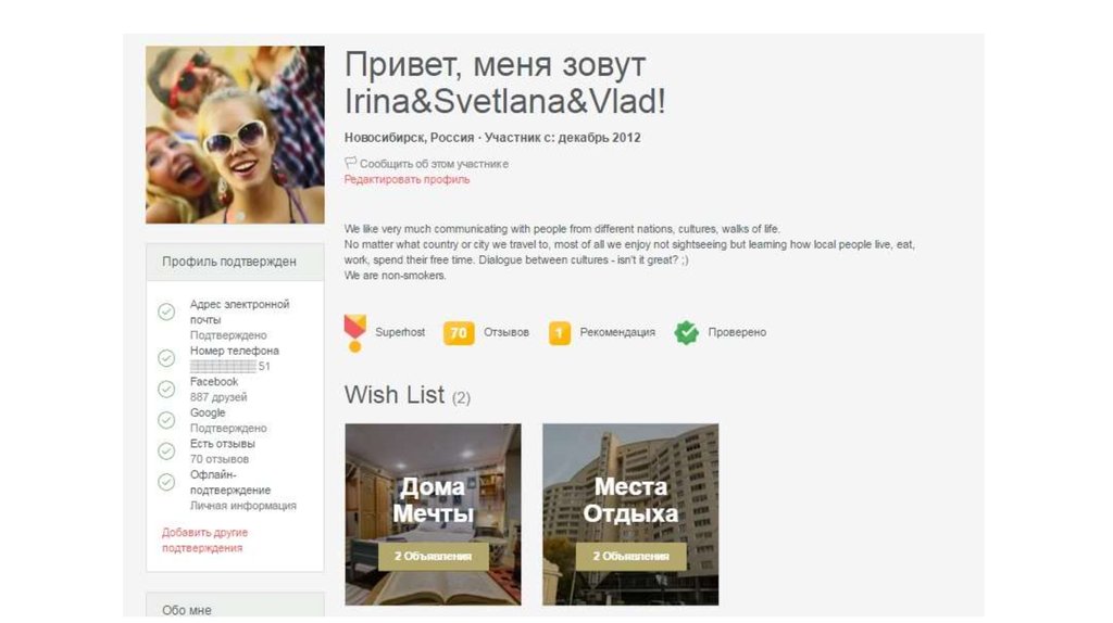 1. Мы на airbnb: https://www.airbnb.ru/users/show/4347518