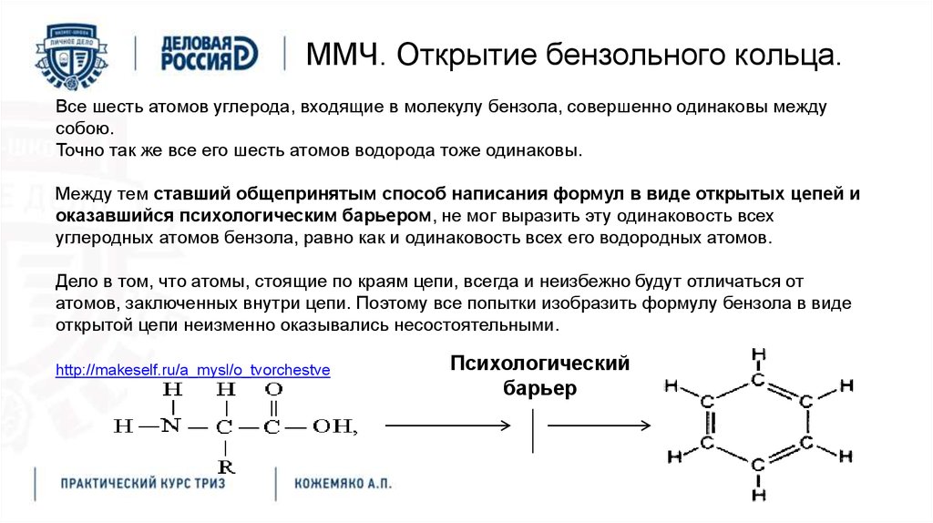 ММЧ. Открытие бензольного кольца.Все шесть атомов углерода, входящие в молекулу бензола, совершенно одинаковы между
