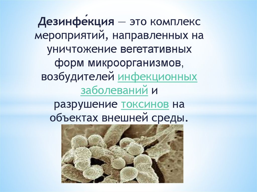 Дезинфе́кция — это комплексмероприятий, направленных на