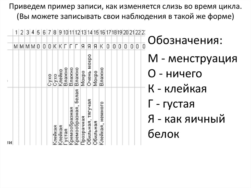 Приведем пример записи, как изменяется слизь во время цикла.(Вы можете записывать свои наблюдения в такой же форме)