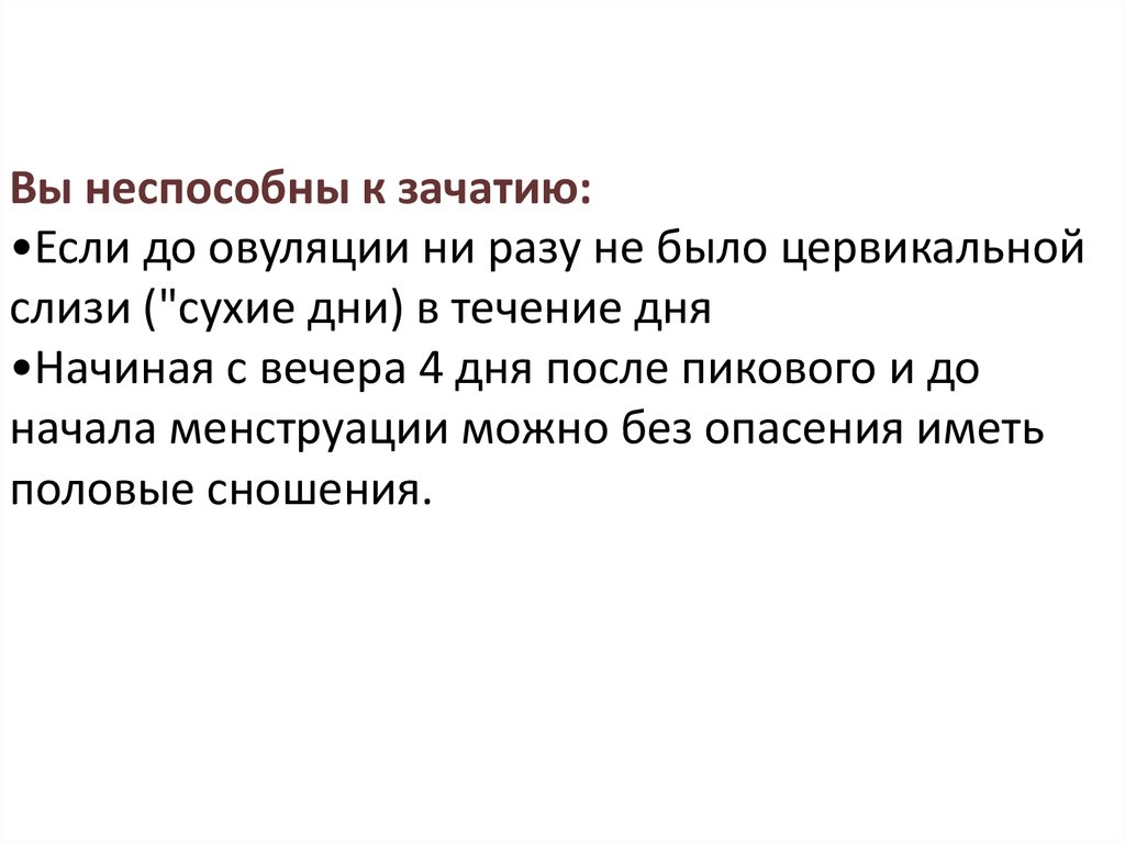 Вы неспособны к зачатию:•Если до овуляции ни разу не было цервикальной